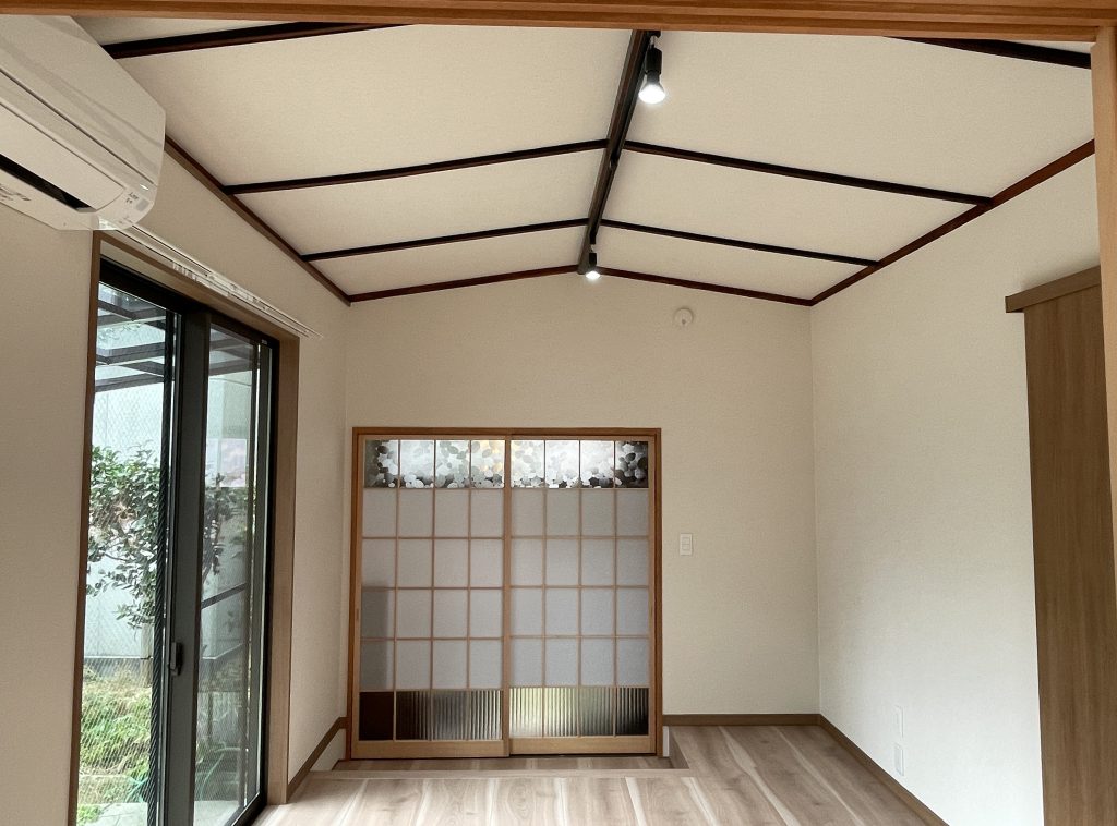 間仕切り建具の上下には、改装前の部屋に使われていたレトロな窓ガラスをはめ込み、長年暮らした部屋の思い出を残すことができました