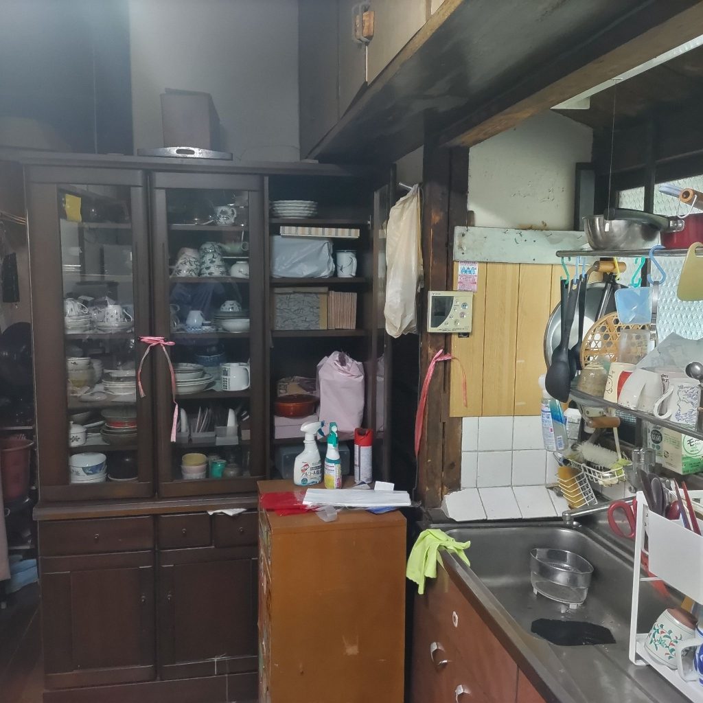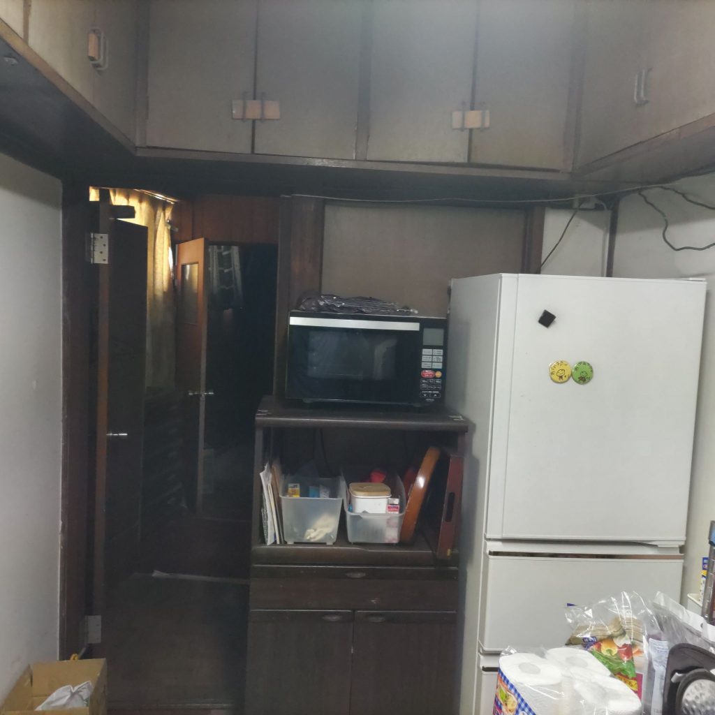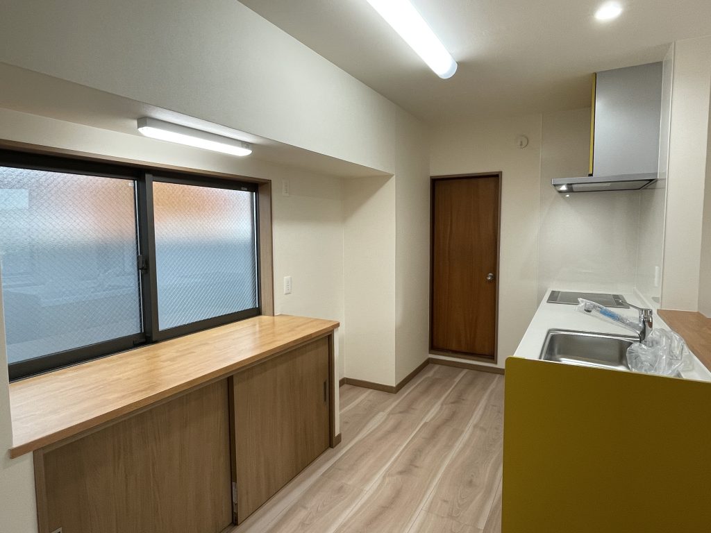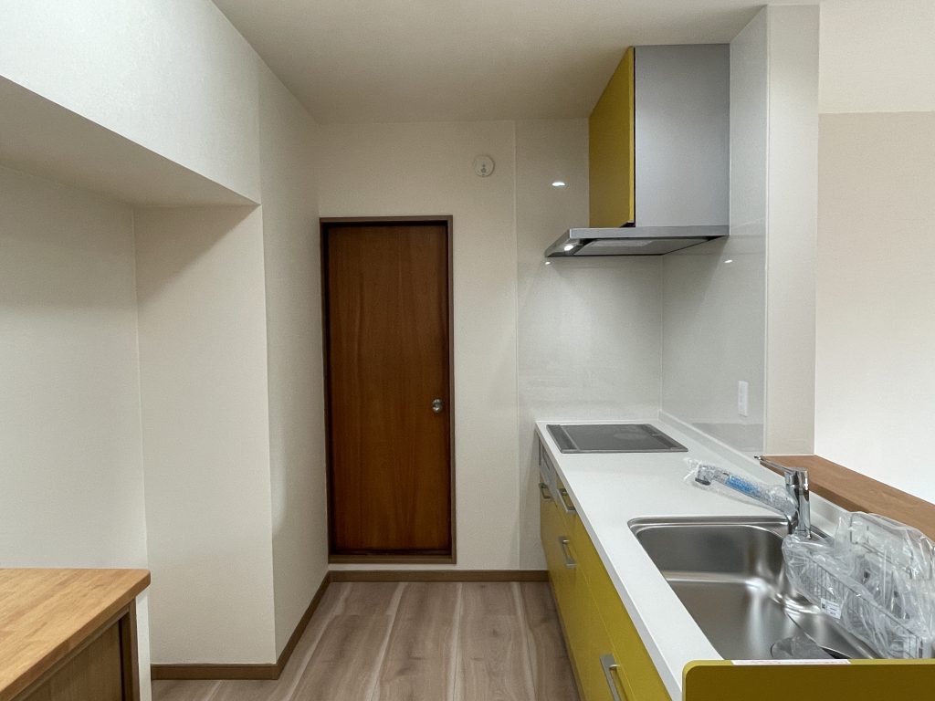 古い流し台と食器棚は撤去し収納棚へ造り替え、勝手口ドアも取替えました