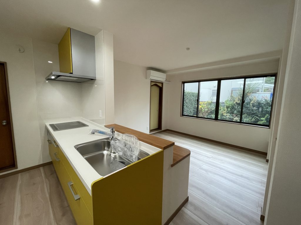 古い吊戸棚を撤去、対面キッチンとしたことでLDKが明るくなりました