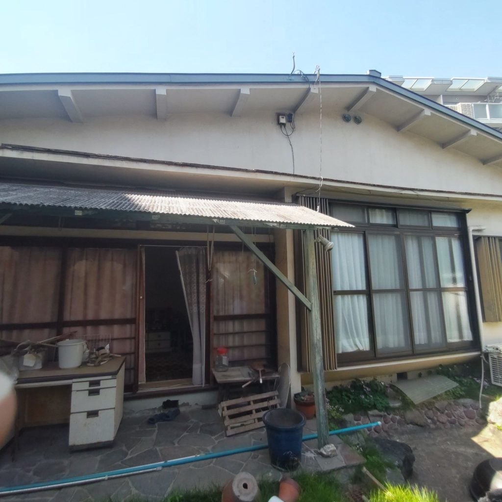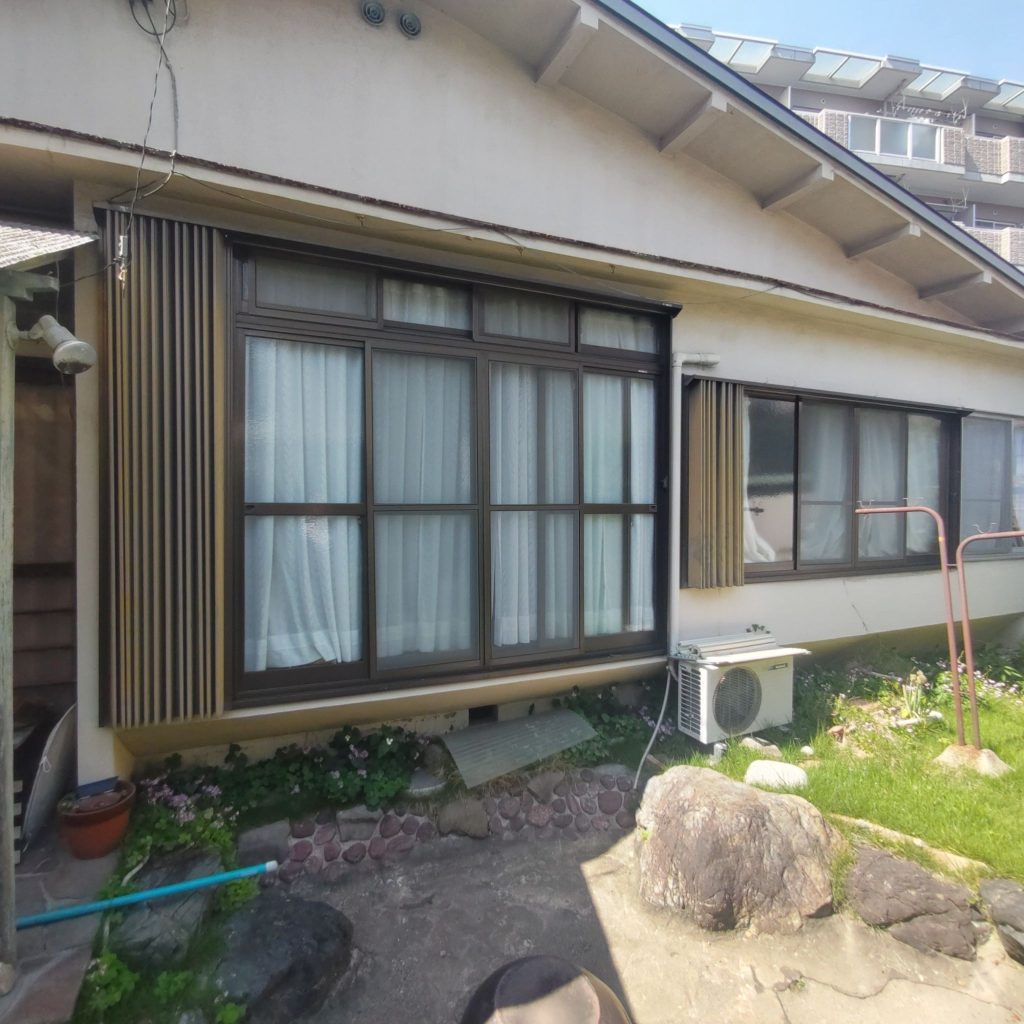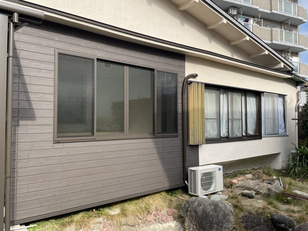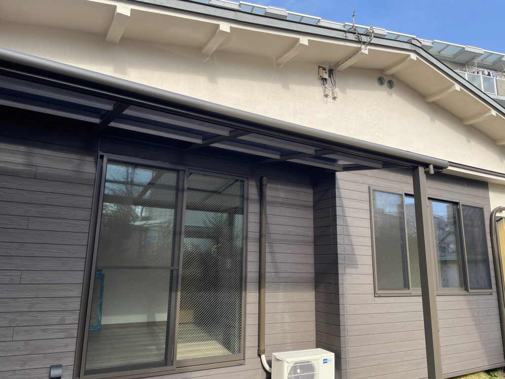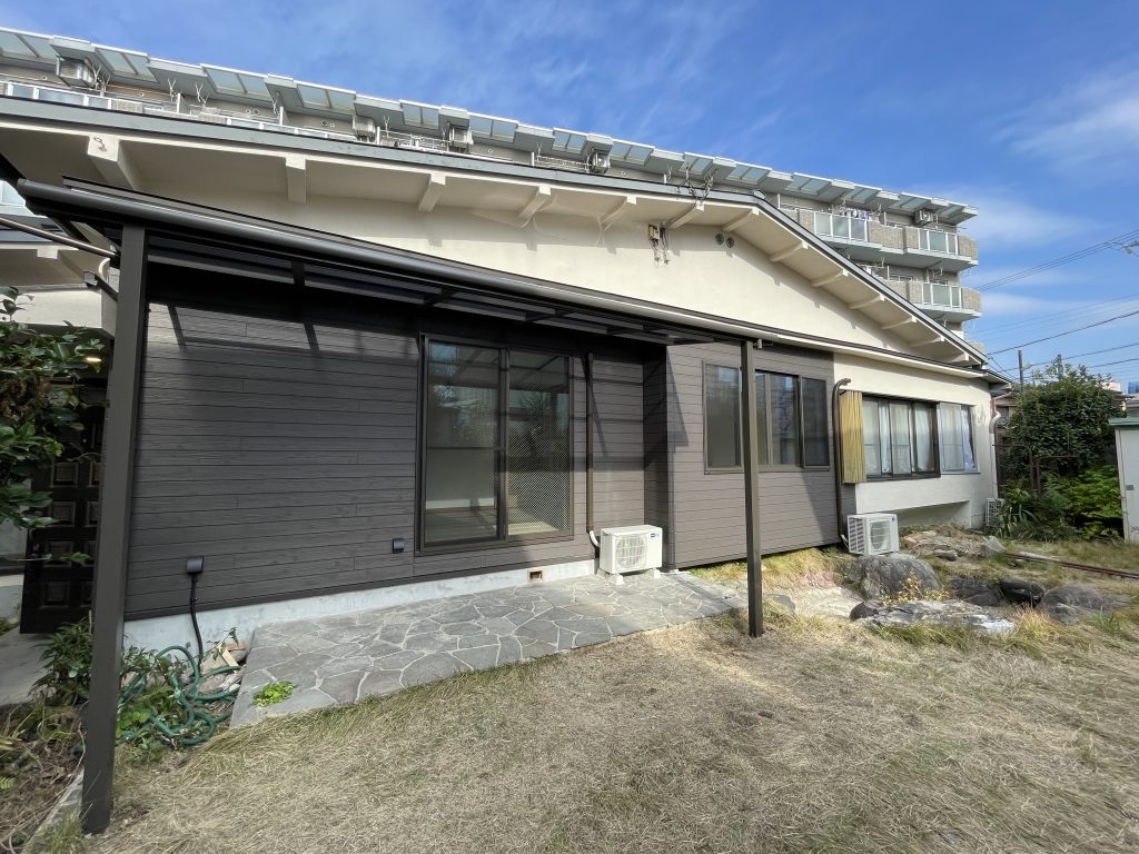 古いトタンの下屋を撤去しアルミのテラス屋根を設置、4本引きだった木製ガラス窓を2本引きアルミサッシに交換し、外壁をサイディングにやり替えました