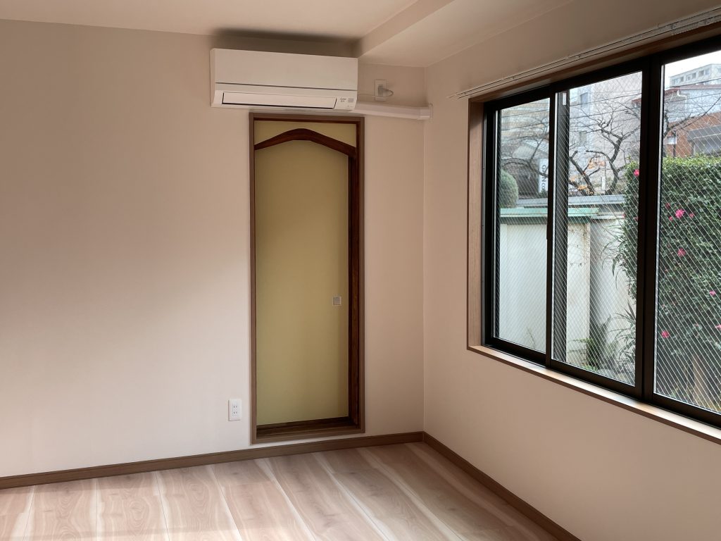 掃出し窓を腰窓に交換、戸襖を明るい黄色に張替え、照明器具・エアコンも取替えました